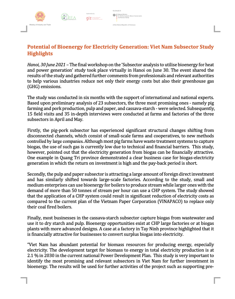 The study falls within the framework of the ‘Climate Protection through Sustainable Bioenergy Markets in Viet Nam’ (BEM) project, which is jointly implemented by the Electricity and Renewable Energy Authority (EREA) of the Ministry of Industry and Trade (MOIT) and the Deutsche Gesellschaft für Internationale Zusammenarbeit (GIZ) GmbH. The project is commissioned by the German Federal Ministry for the Environment, Nature Conservation and Nuclear Safety (BMU).