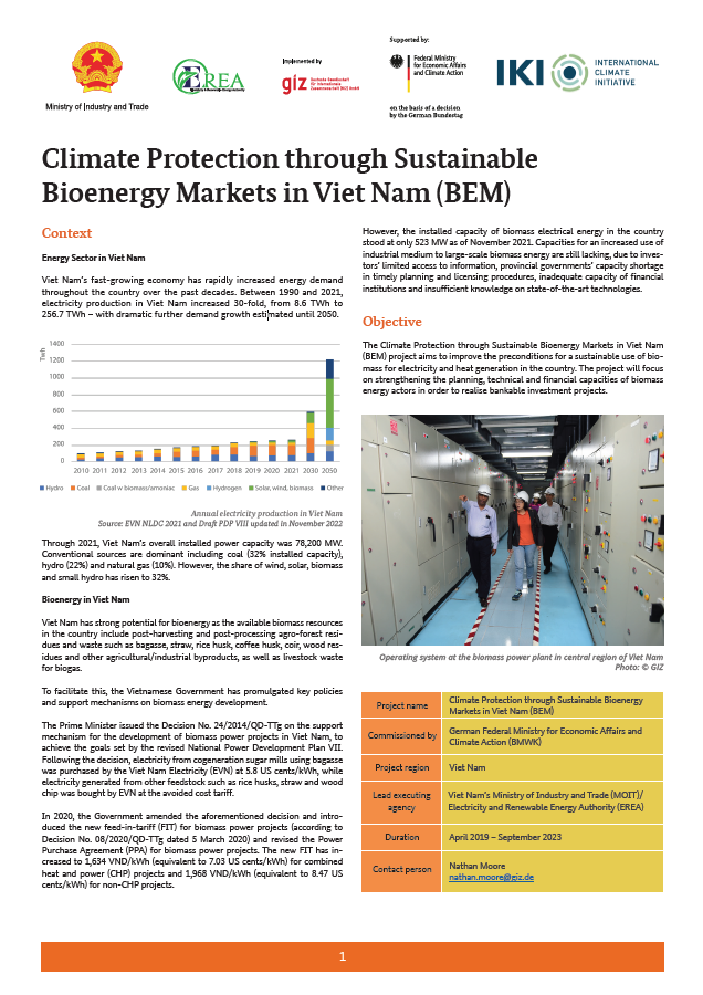 The Climate Protection through Sustainable Bioenergy Markets in Vietnam project aims to improve the preconditions for sustainable use of biomass for electricity and heat generation in the country. The project will focus more on the improvement of planning, technical and financial capacities of respective actors in the biomass energy sector in order to realize bankable investment projects.