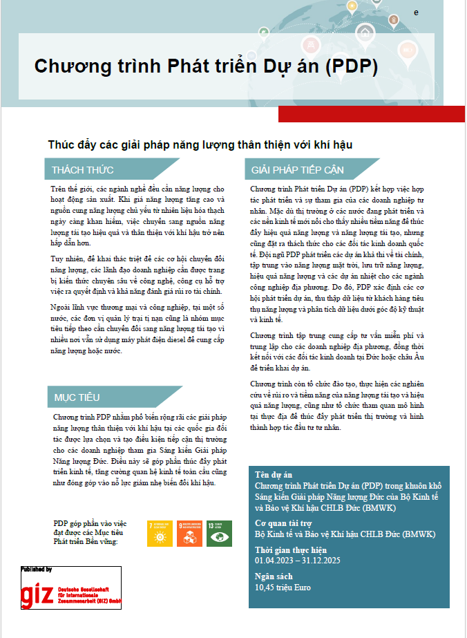 Tiếng Việt: THỜI GIAN: 03/15-06/26 CƠ QUAN TÀI TRỢ: Bộ Kinh tế và Năng lượng Cộng hòa Liên bang Đức (BMWE) Chương trình Phát triển Dự án (PDP) là chương trình dự án toàn cầu, triển khai các hoạt động tại Nam Á và Đông Nam Á (Ấn Độ, Bangladesh, Indonesia, Việt Nam), Bắc Phi, Tây Phi, Đông Phi và Nam Phi (Ma-rốc, Senegal, Bờ biển Ngà, Ghana, Nigeria, Kenya, Nam Phi) và Nam Mỹ (Argentina). Chương trình được ủy quyền và tài trợ bởi Bộ Kinh tế và Năng lượng Cộng hòa Liên bang Đức (BMWE) trong khuôn khổ Sáng kiến các Giải pháp Năng lượng Đức, nhằm hỗ trợ các doanh nghiệp Đức thiết lập quan hệ đối tác thành công và phù hợp với bối cảnh tại các thị trường nước ngoài.