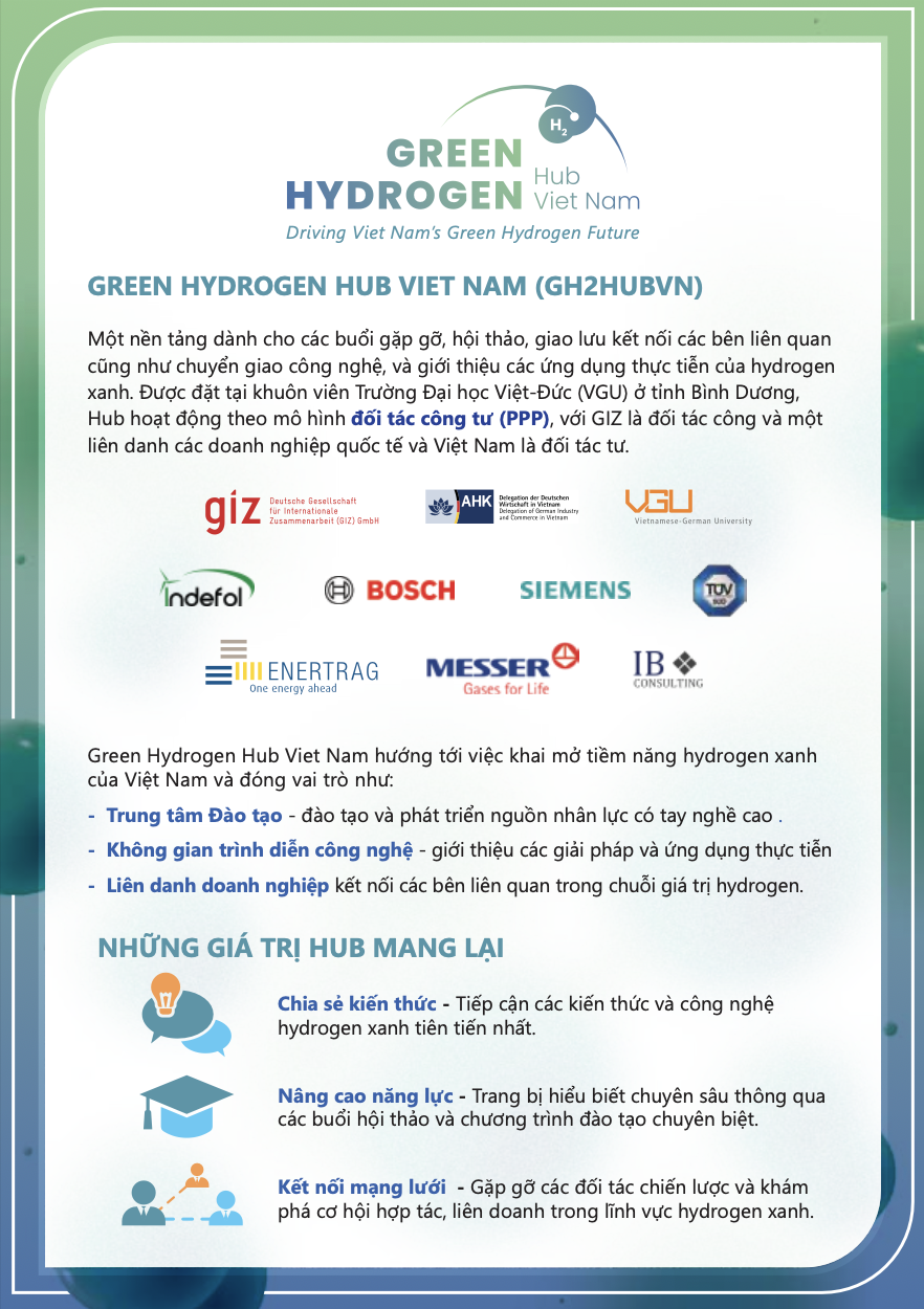 Trung tâm Hydrogen Xanh Việt Nam tập trung vào việc thúc đẩy chia sẻ kiến thức, giới thiệu các ứng dụng GH2 trong thực tiễn, hỗ trợ phát triển nguồn nhân lực và tăng cường hợp tác giữa các bên liên quan Việt – Đức trong toàn bộ chuỗi giá trị hydrogen.